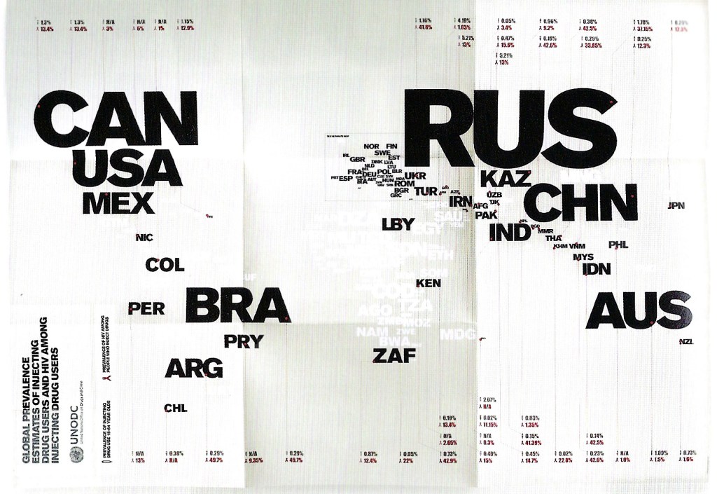 Type does not only evoke emotion, it can clearly and quickly communicate with precision and little effort. Type can express importance in the mere adjustment of its size – creating a hierarchical value – as space can with more or less of itself. The scale of type provides the determination of where to start and where to finish. With just a glance, you can identify the countries that dominate and those that do not, in the above 2009 typographic poster created by Harry Pearce and Jason Ching that compares drug treatment programs, HIV incidence, and other data worldwide.